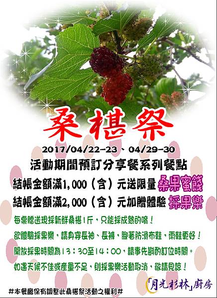 4/22-4/23與4/29-4/30預訂分享餐系列餐點,結帳金額滿$1000(含)送桑果蜜餞;滿$2000(含)開放體驗桑椹採果樂趣,詳情請參閱活動海報。